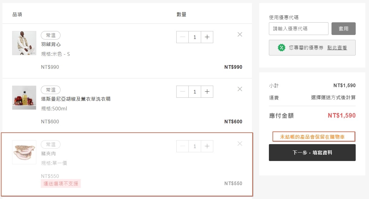 - 某些產品無法選擇相同的運送方式結帳時,未結帳的產品會保留在購物車