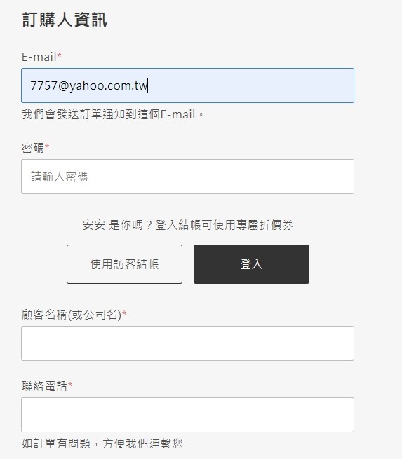 - 在填寫表單時,偵測輸入的E-mail或手機,若是已經註冊的會員資料,提醒是否要登入,在此輸入密碼可以快速登入