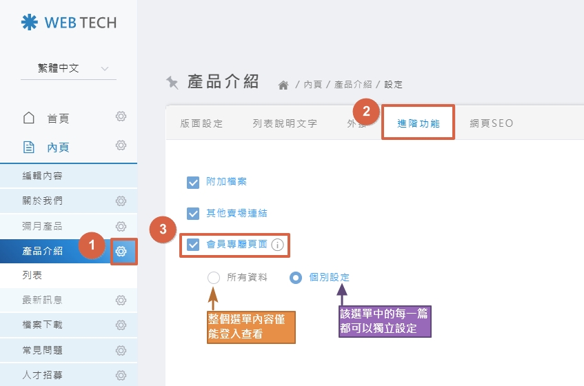 「個別設定」:可以獨立設定不同商品/頁面是否要限定會員觀看。