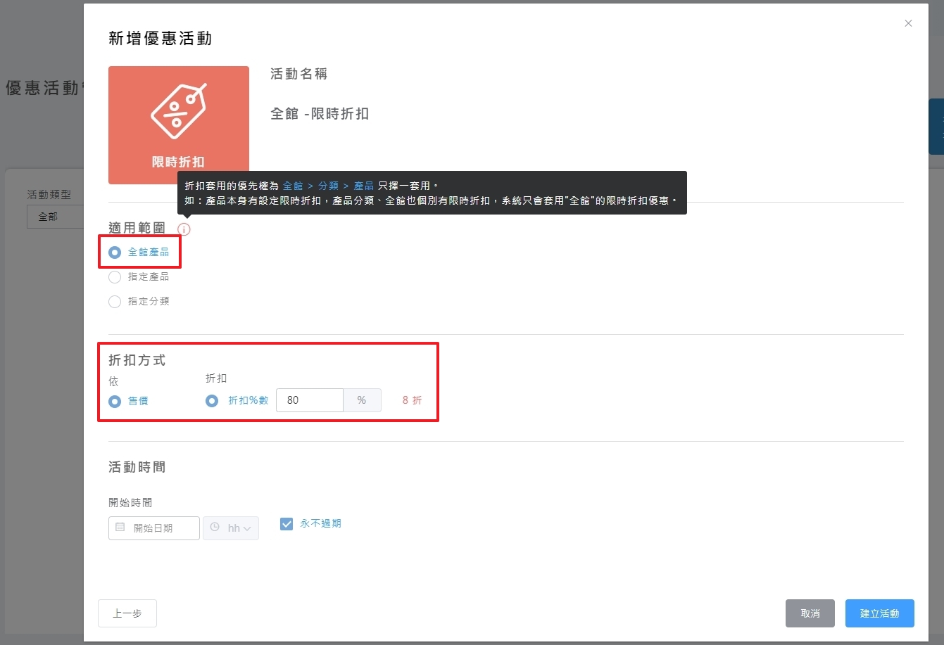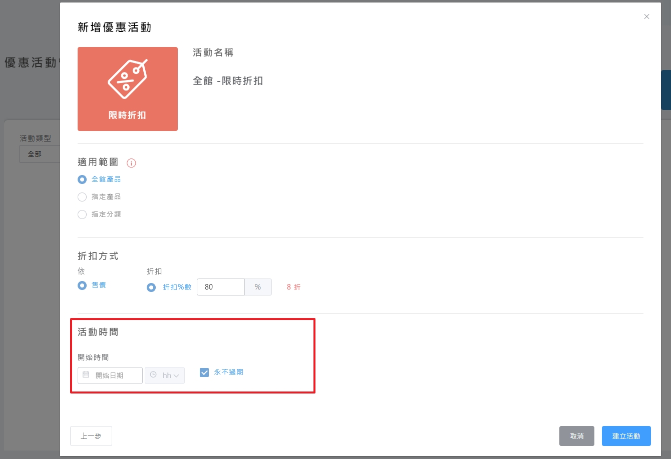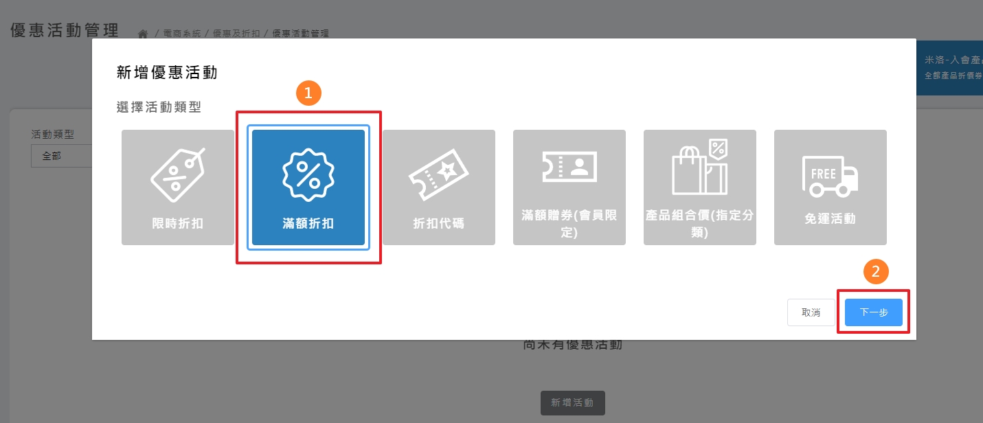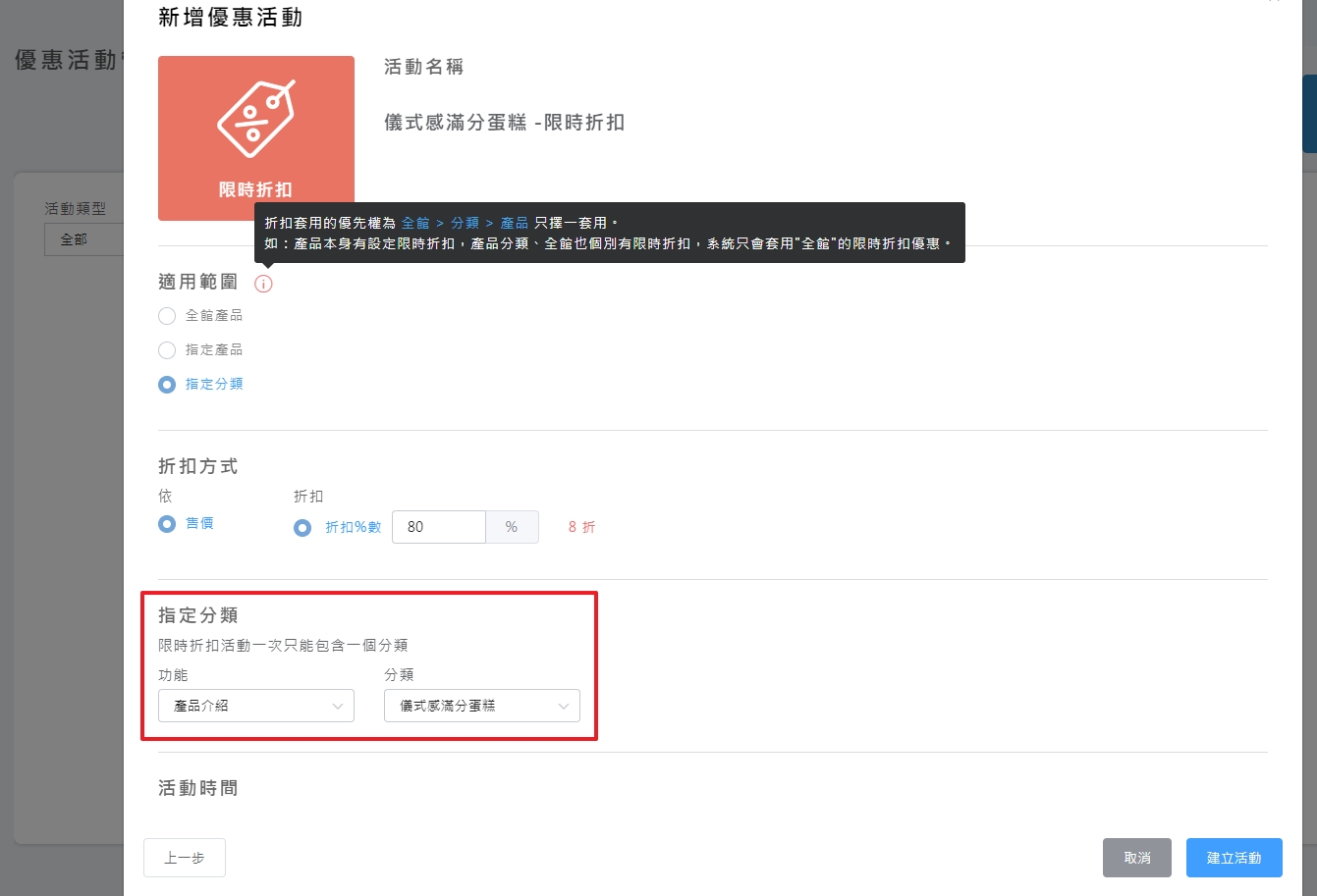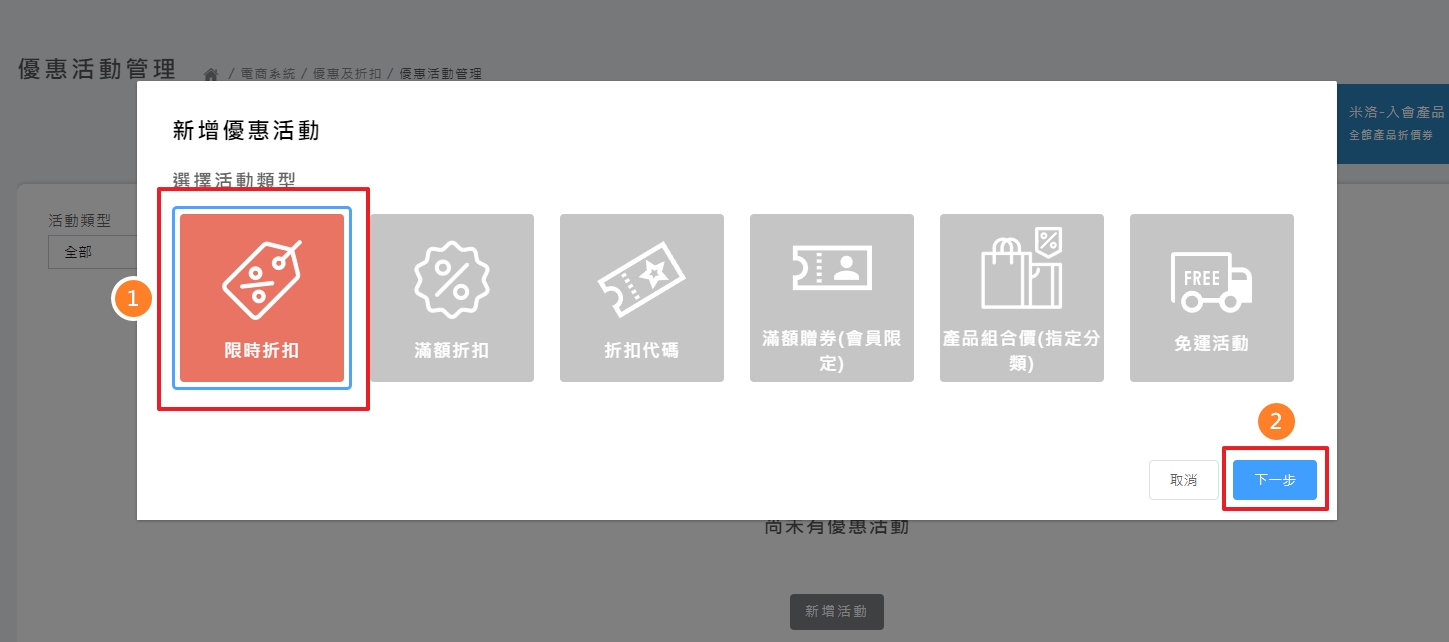 在新增優惠活動視窗中,點選「限時折扣」後點擊「下一步」按鈕