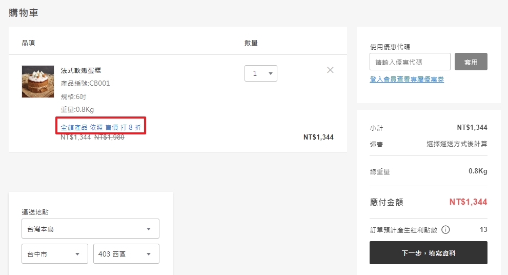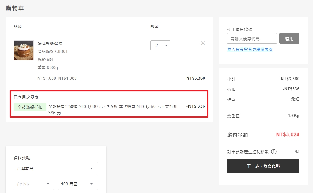 當消費者將符合條件的產品放在購物車內,系統即會顯示折扣內容及金額。