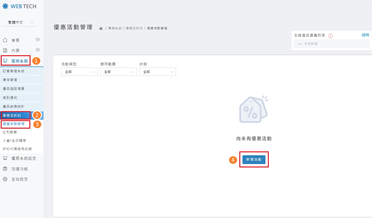 點選「電商系統」>「優惠及折扣」>「優惠活動管理」> 點選「新增活動」