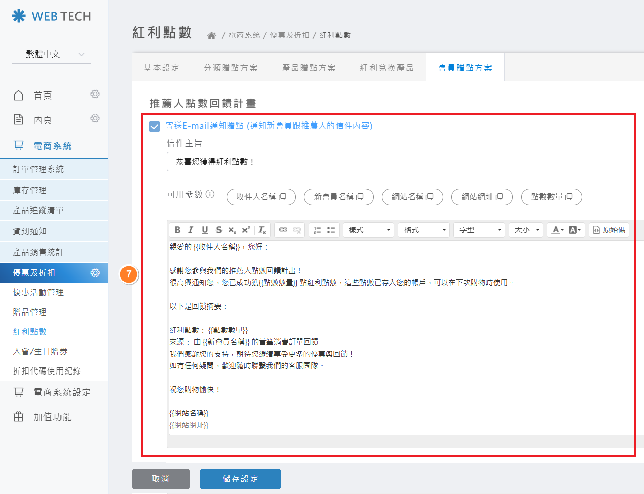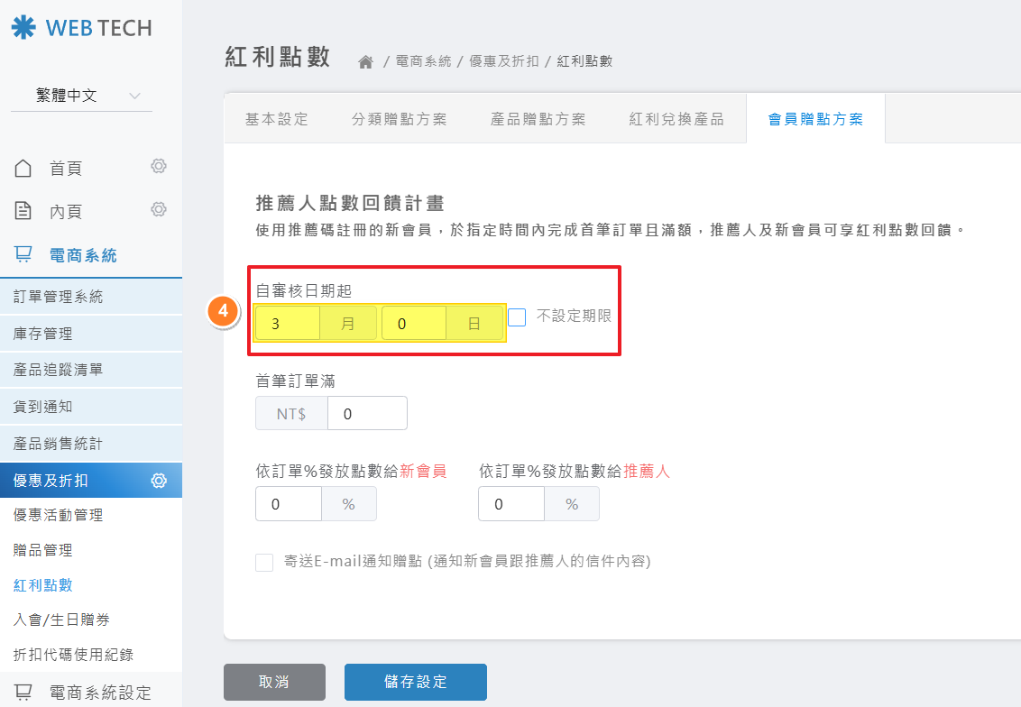 點選「電商系統」>「優惠及折扣」>「紅利點數」>「會員積點方案」> 設定「推薦人點數回饋計畫」