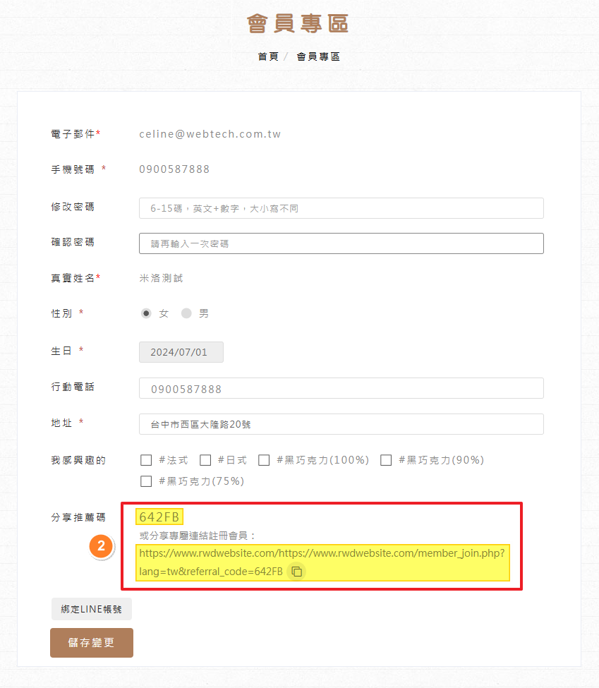 系統會自動產生「專屬的推薦碼」和「專屬的註冊連結(使用此網站註冊新會員,系統會自動填入推薦碼)」,推薦人可直接分享給新客進行註冊。