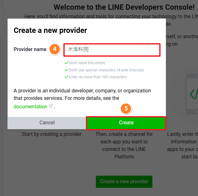 填入 「Provider name (服務提供者名稱)」並點選「Create」。