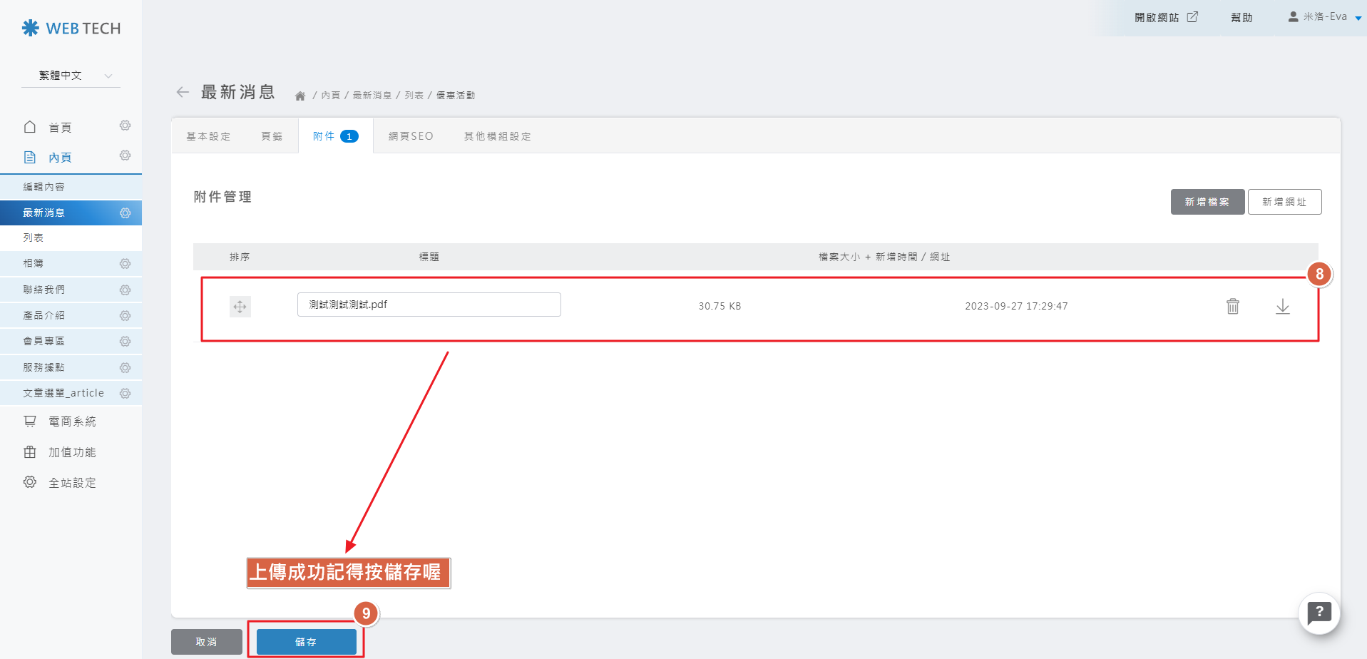 備註:如 貴公司後台,選單【產品】和【文章】頁面無[附件]分頁,可請 貴公司的專屬客服開通