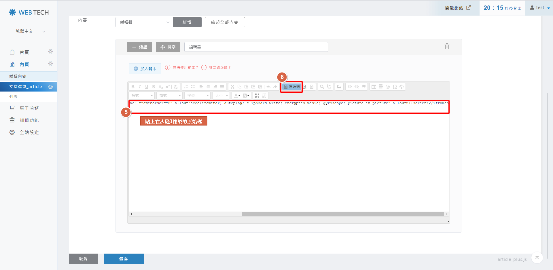 將步驟3複製的原始碼貼在編輯區塊,貼上後再按「原始碼」。