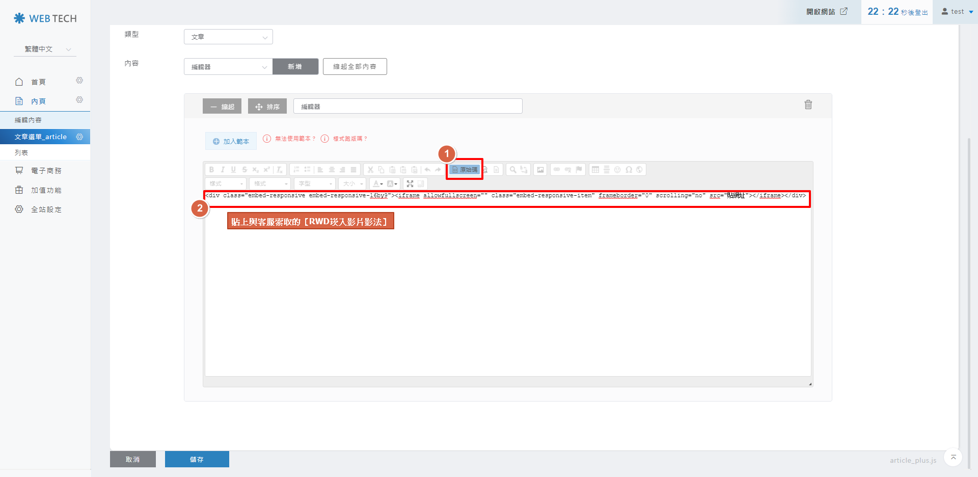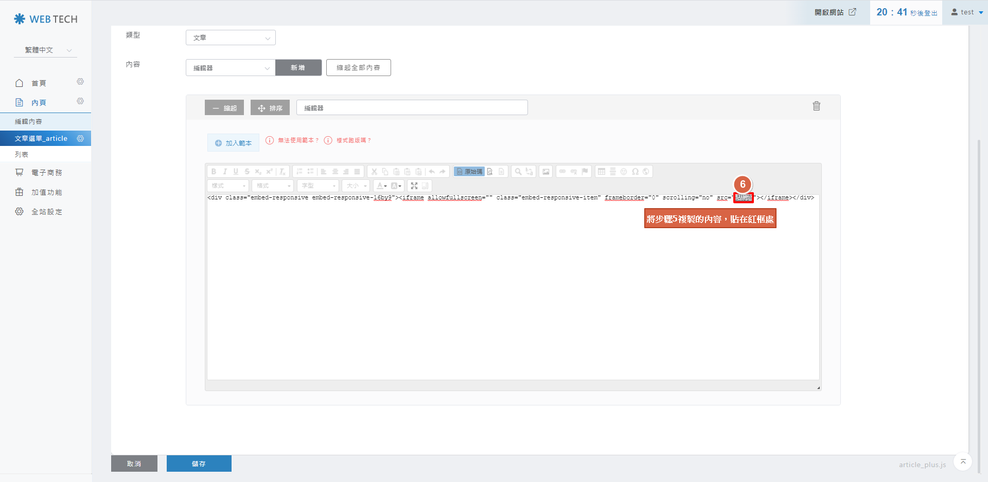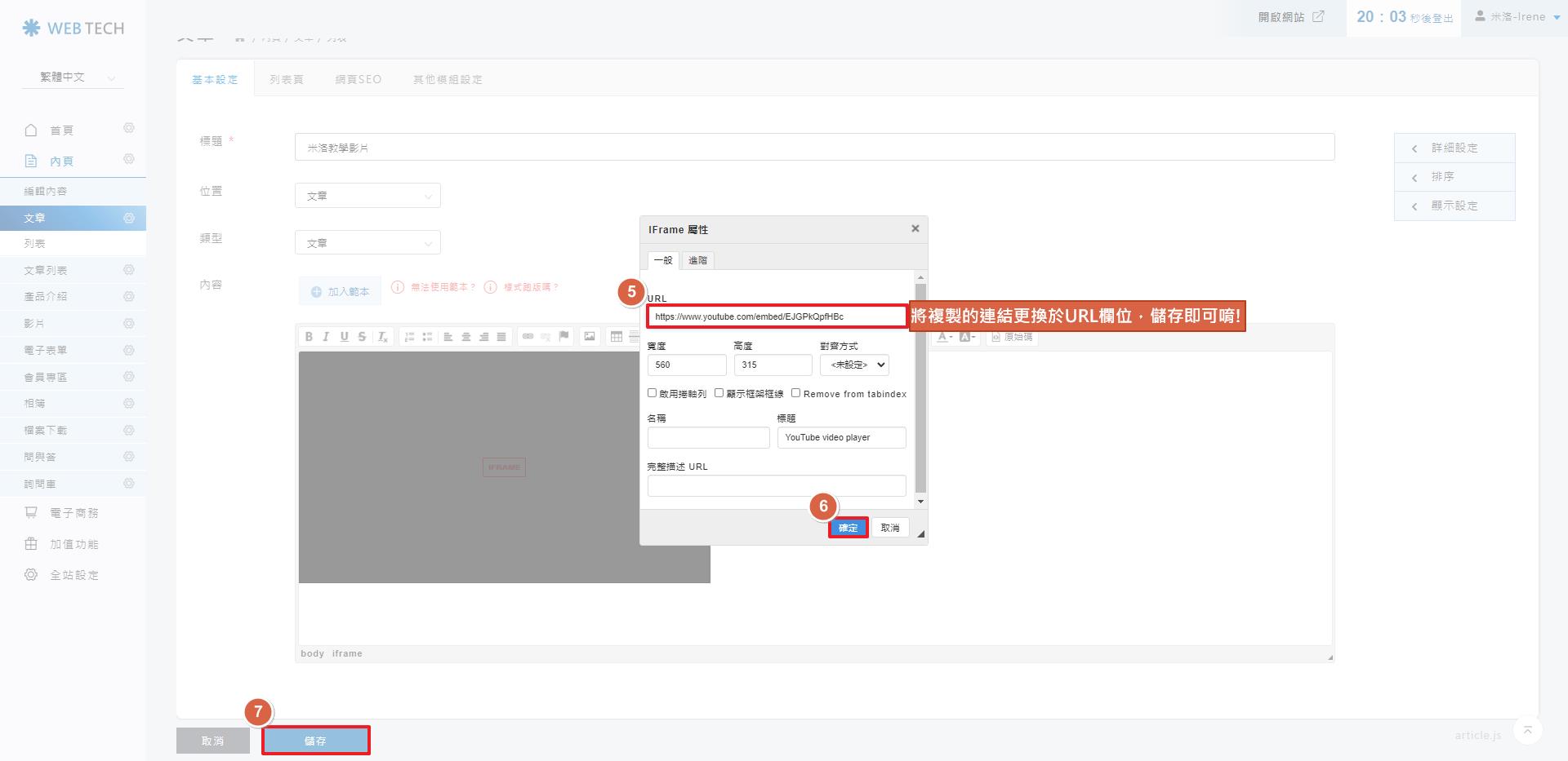 將步驟5複製的youtube連結,取代後台編輯區塊的【您的youtube影片網址】。