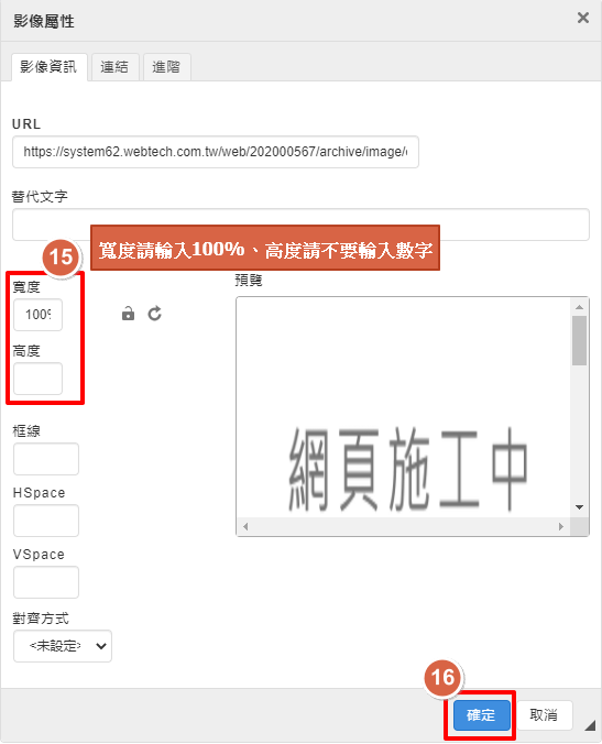 寬度請調整為100%、高度如果有數字請刪除,高度不要有任何數字,這樣圖片才能等比例縮放,調整完成後請點擊「確定」,再點擊編輯器底下的「儲存」
