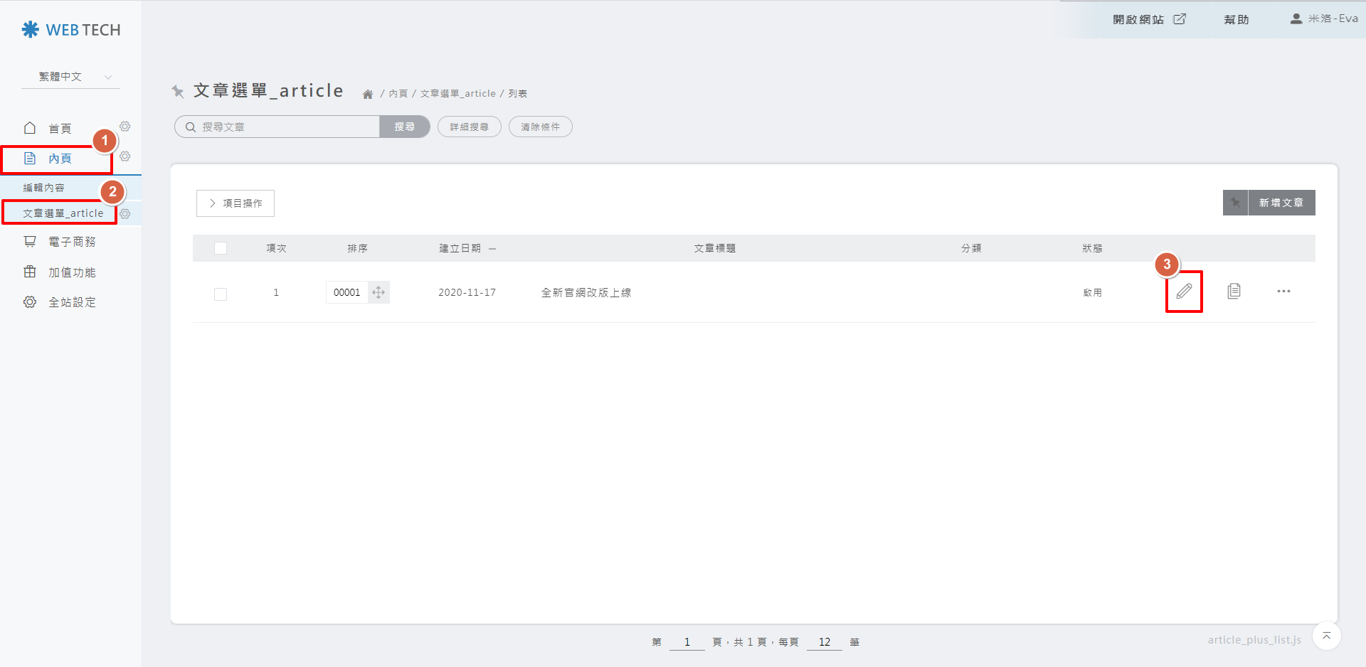 請先點擊「內頁」>「文章選單_article」,在想要上傳檔案的文章項目右後方,點選一枝筆