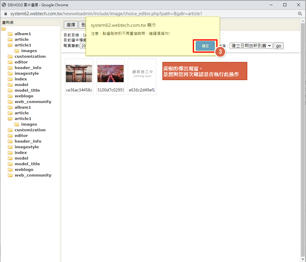 圖片刪除即無法回復,建議刪除前,請再三確認,並至後台「資料備份」內進行備份。