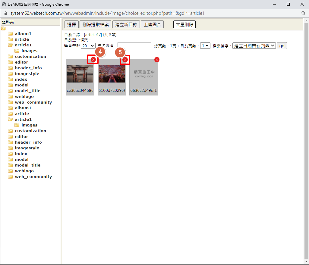 4. 步驟三點選「確定」後,每一張圖片右上方都會出現可執行刪除的icon,將想要刪除的圖片點選此icon即可。